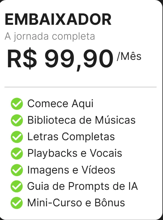 Exclusivo para Embaixadores: acesse um mini-curso e aulas bônus. Aprenda sobre criação musical, bastidores e técnicas de IA para aprimorar sua criatividade e seu ministério.
