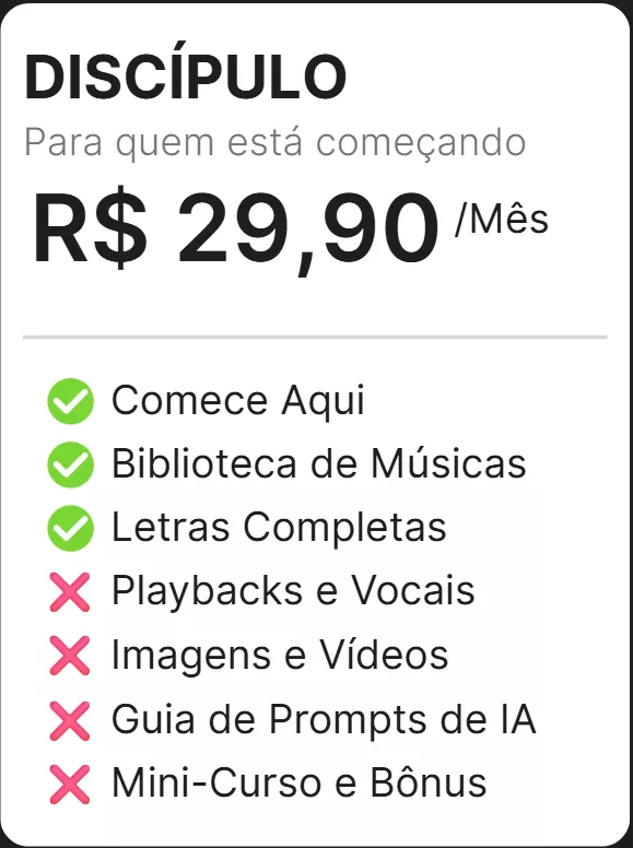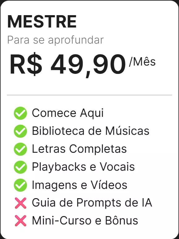 Uma área exclusiva com aulas sobre criação musical, bastidores das produções e técnicas de IA para aprimorar sua criatividade e seu ministério. (Incluso no Plano Embaixador).